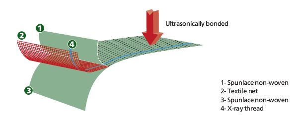 It consists of two layers of spunlace non-woven material, widely used in the medical market, and a textile net in between. The three layers are sealed together by ultrasonics.