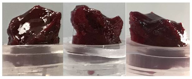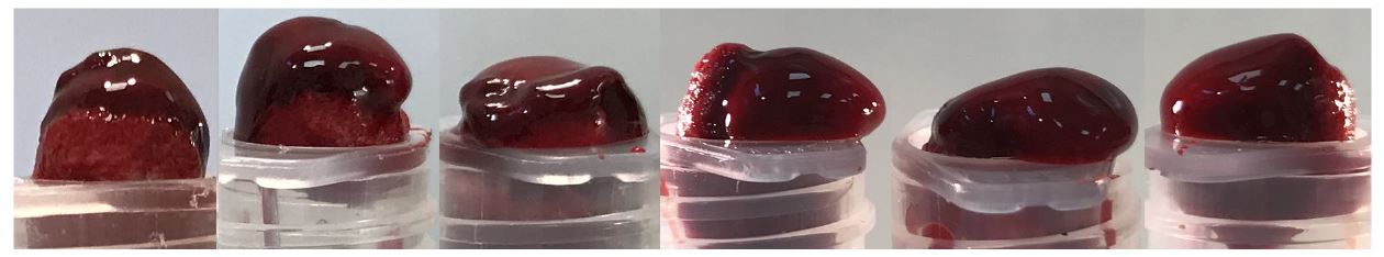 Other competitor products show they have no clot attached. The blood is only absorbed into the product, forming a light sticky gel and due to the fact that this product has to be removed, it counteracts the natural processes of clot formation. The product itself has hardened to jagged edges that do not conform to the shape of the injury (in this case, a circular test tube).