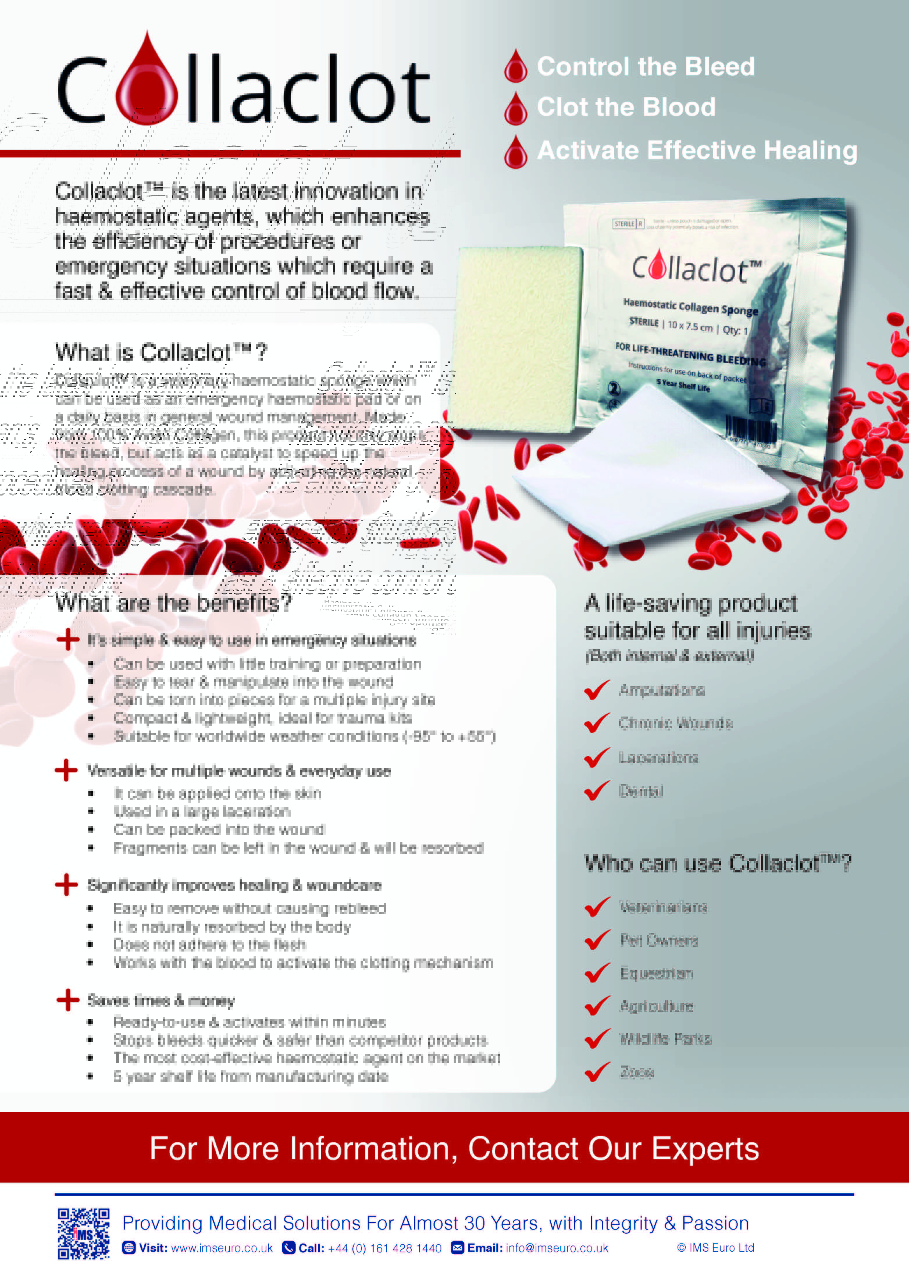 We have marketing materials available to inform, educate and help make your decision to purchase Collaclot™. Whether you work with small or large animals or are wanting more information on Clotta™ for Human Healthcare, we can help you understand why this product would be a perfect fit for your organisation. If you require any further information, simply get in touch with our experts here at IMS.