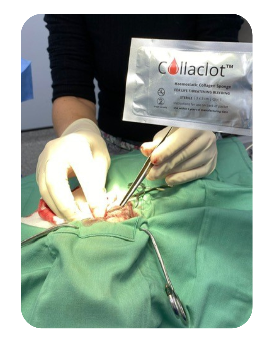We used Collaclot™ effectively on a spleen bleed and were very happy with the result. Also used on a liver biopsy where stitching and cautery failed to control the bleed post-procedure, but Collaclot™ worked and the Vet was very impressed. Patients incisions were closed with confidence that the product had stopped and controlled any potential re-bleed effectively. Both patients were dogs, with the liver biopsy being performed on a Corgi.